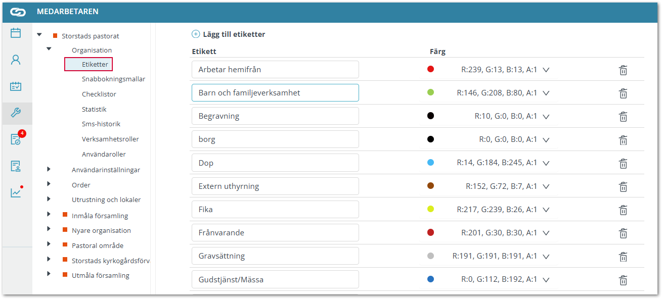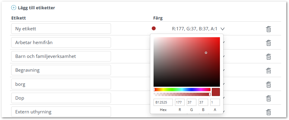 I administrationsmodulen under Organisation > Etiketter kan du skapa nya etiketter för organisationen och redigera de som redan finns. Etiketterna fungerar som en märkning av bokningarna och etikettens färg visas i kalendern för att det lätt ska synas vilken typ av bokning det handlar om. I kalendern går det att filtrera på etiketter.