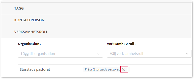 Om kontakten har en verksamhetsroll tillagd så behöver verksamhetsrollen tas bort innan kontakten kan raderas. Verksamhetsrollen tas bort genom att klicka på krysset vid verksamhetsrollen.