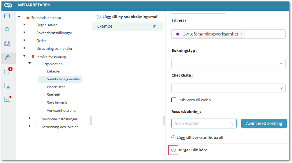 Om kontakten är tillagd i någon snabbokningsmall så behöver kontakten tas bort från mallen. Öppna redigeringsvyn för snabbokningsmallen och klicka på krysset vid kontakten. Ändringen sparas sedan automatiskt.