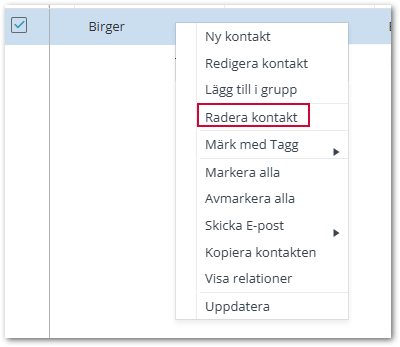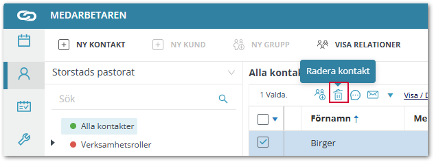 Efter dessa steg kan kontakten raderas. Det görs genom att gå till Kontakt- & Gruppmodulen. Markera den kontakt du vill radera och sedan klicka på Radera kontakt ovanför kontaktlistan.Det går även att radera en kontakt genom att högerklicka på kontakten och välja Radera kontakt.