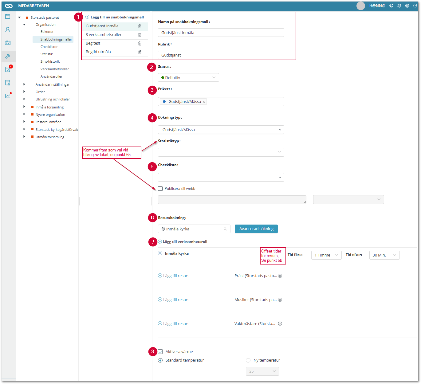 - För resurser kan du också välja om de ska bokas med extra tid före och/eller efter en bokning. Till exempel om du bokar en gudstjänst mellan 11-12 men du vill att kyrkan alltid ska vara bokad från en timme innan själva gudstjänsten och även 30 minuter efter för förberedelser och efterstäd. Då kan du lägga till det i mallen så kommer den resursen alltid bokas med den extra tiden vid användning av mallen.
