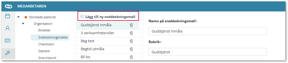 - Klicka på Lägg till ny snabbokningsmall och ange namn för mallen. Du måste även skriva en rubrik, det vill säga en början till den rubrik som ska sättas på bokningen då mallen används.