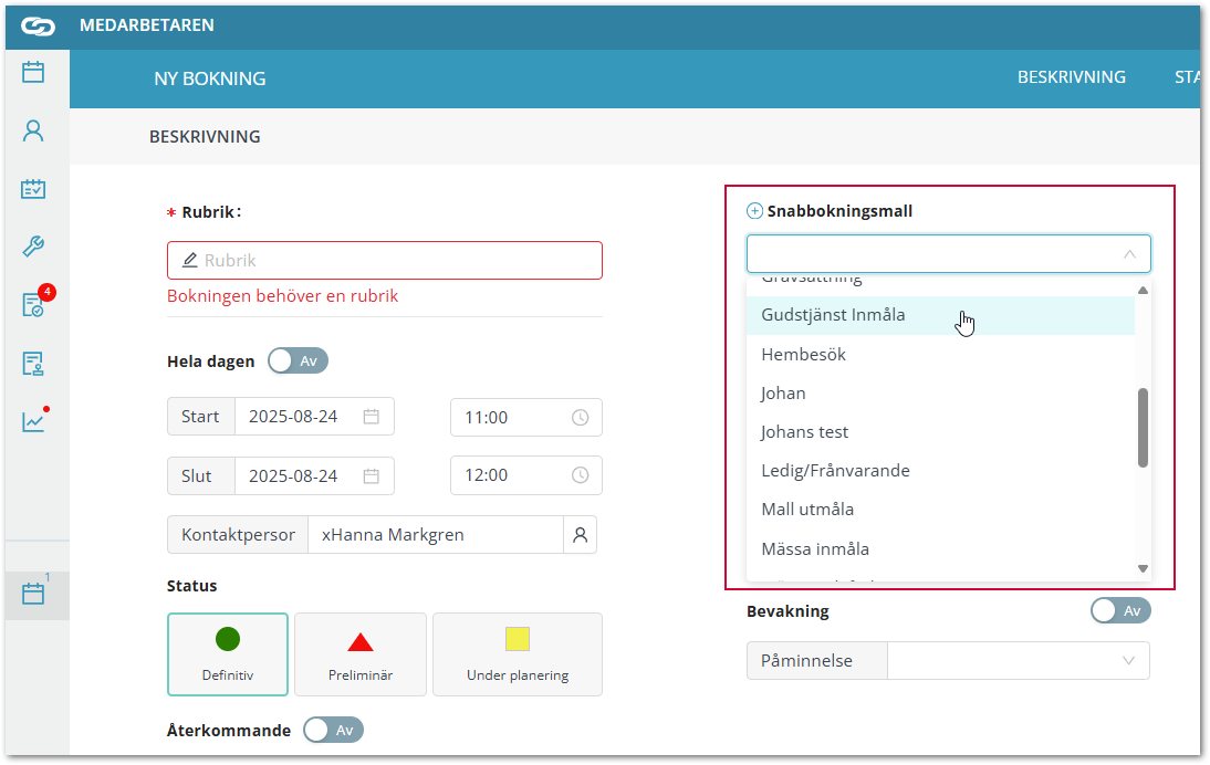 När du skapar en ny bokning så kan du i bokningen klicka på fältet under Snabbokningsmall för att lägga till en mall till din bokning.