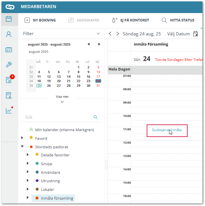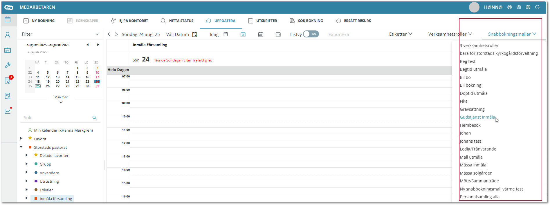 När du drar muspekaren in i kalendern så visas namnet på snabbokningsmallen som du valt.