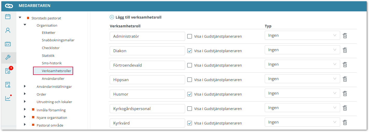 Uppgiften om Visa i Gudstjänstplaneraren ställer in om verksamhetsrollen skall visas i Gudstjänstplaneraren.