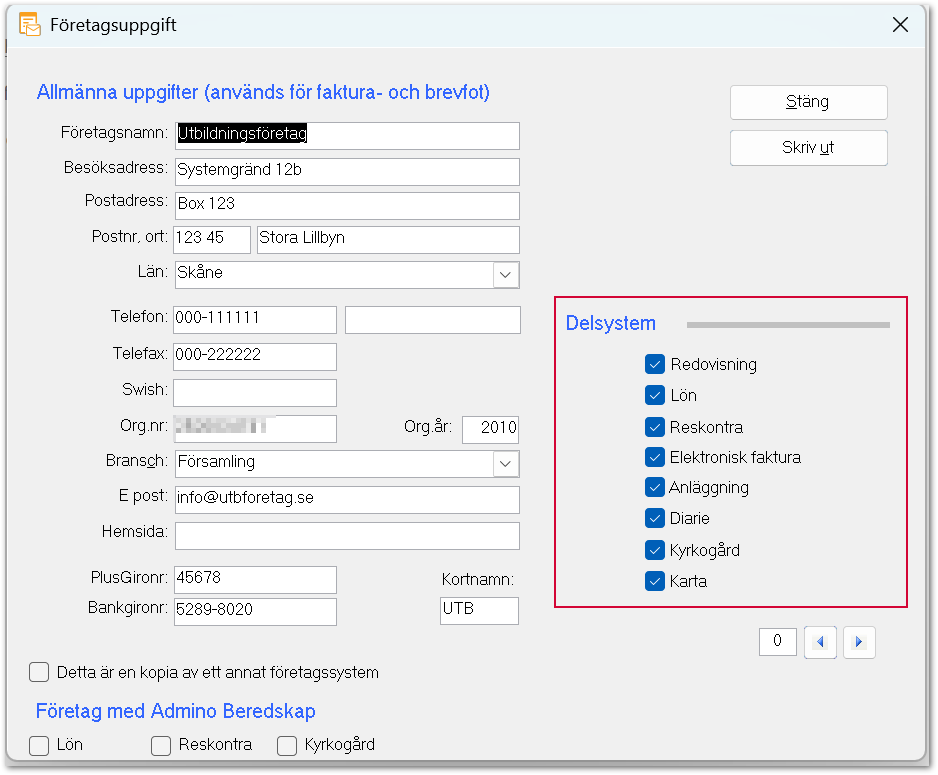 - Om delsystemen delar företagsuppgift gäller ändringen för samtliga valda system. Annars görs inställningen för respektive delsystem. Bekräfta genom att klicka på Stäng. Under rubriken Delsystem visas om företagsuppgiften delas mellan de olika delsystemen.