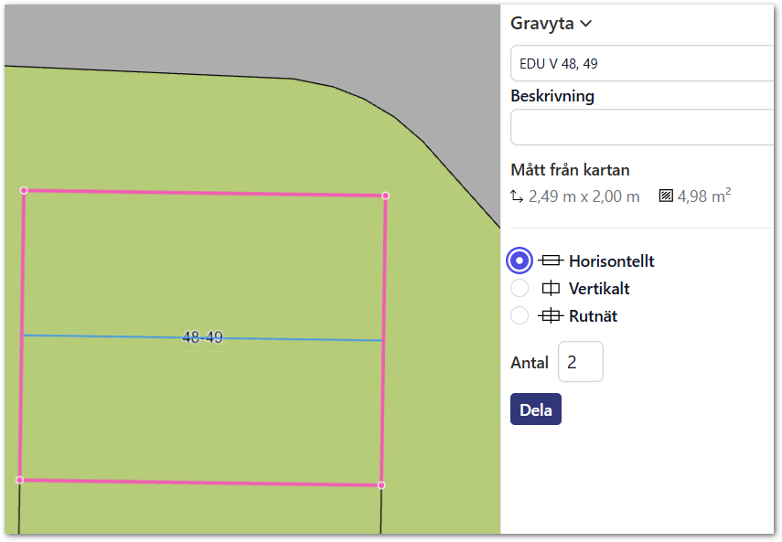 - I den högra sidopanelen kan du nu välja om du vill dela gravplatsen horisontellt, vertikalt eller i ett rutnät. Du får även ange antal delar du vill dela gravplatsen i. Det visas hur gravplatsen kommer att delas med blå linjer, så du kan säkerställa att det blir som du önskar.