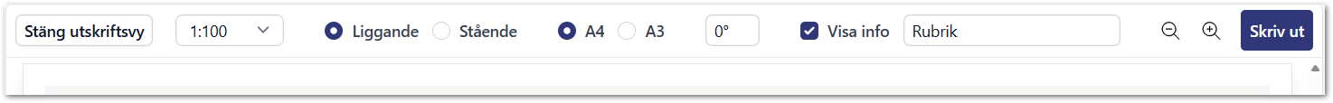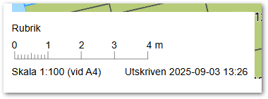 Visa info och Rubrik | Är rutan för Visa info markerad så visas ett informationsfält på utskriften. Under Rubrik på utskriften visas den text som du skriver in i fältet för Rubrik. Har du valt en specifik skala så visas även en skalstock och information om vilken skala som använts. ![]() |