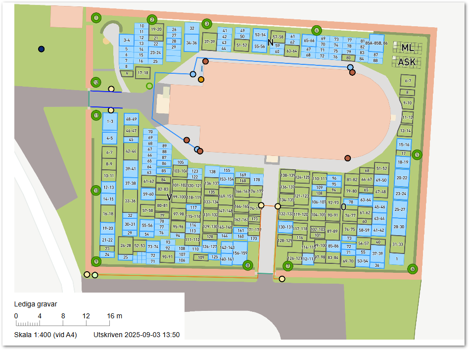 I exemplet nedan är det filtrerat på att visa alla lediga gravar. Rubriken är satt till Lediga gravar för att enkelt hålla koll på vad som är filtrerat på utskriften.