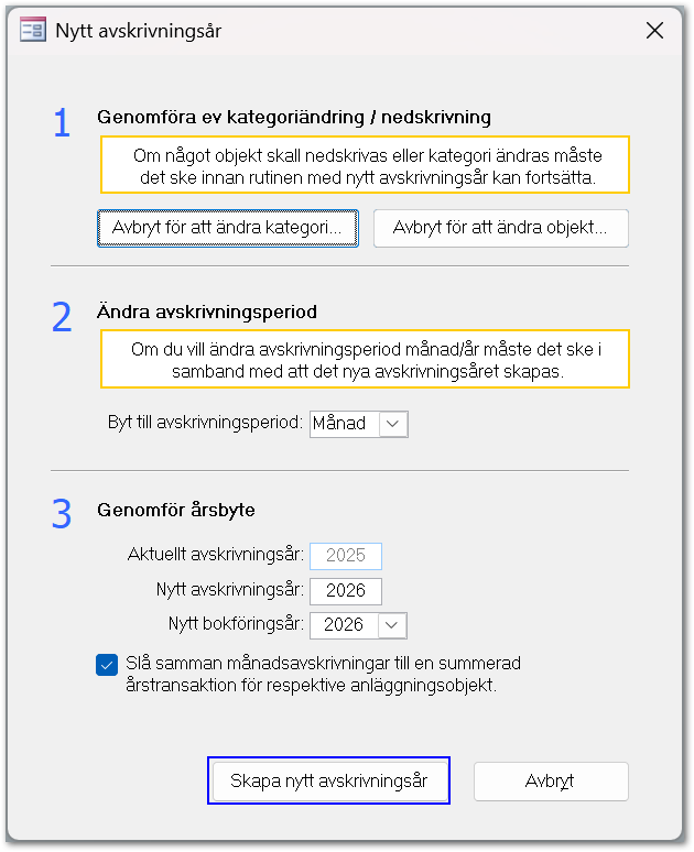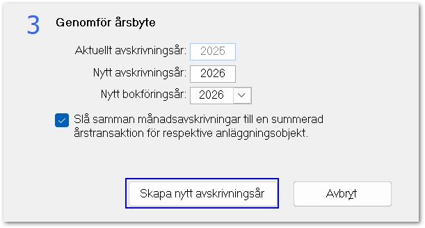 - Tillse att rätt år är valt för Nytt avskrivningsår och Nytt bokföringsår. Vid månadsavskrivning kan du välja att markera Slå samman månadsavskrivningar till en summerad årstransaktion för respektive anläggningsobjekt för att slå samman alla årets avskrivningar till en summerad gemensam post för respektive anläggningsobjekt. Genom att slå samman transaktionerna får du en bättre överblick på anläggningsobjektets transaktioner samtidigt som antalet transaktionsposter minskar.