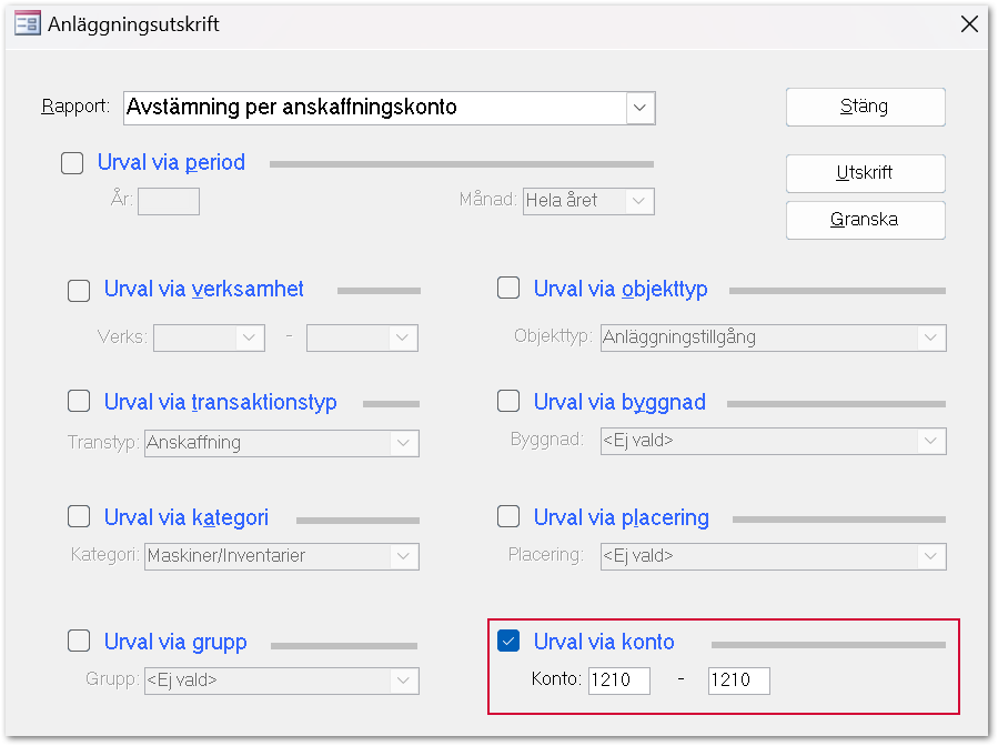 - Avstämning per anskaffningskonto och Avstämning per ack. avskrivningskonto
