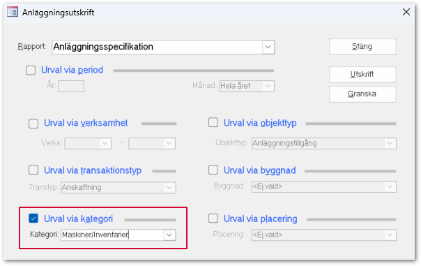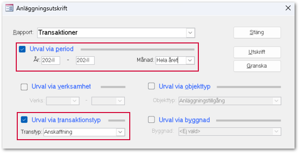 - Gör Urval via transaktionstyp. Skriv en rapport per Anskaffning, Försäljning samt Utrangering.