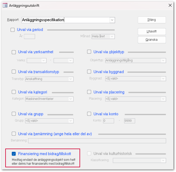 - Används för att göra avstämningar mot respektive balanskonto. Kan även användas för att stämma av inköp under året. Gör då Urval via period och ange bokslutsåret.