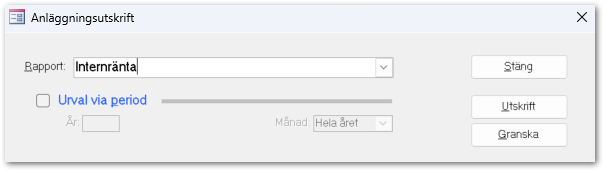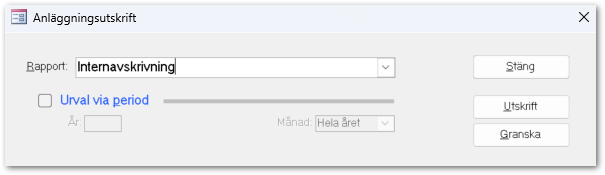 Samtliga rapporter skrivs via Rapporter > Anläggningsutskrift.