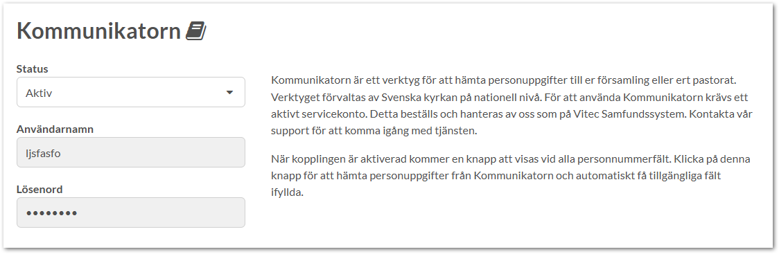 För att använda Kommunikatorn krävs ett aktivt Servicekonto. Detta beställs och hanteras av oss på Vitec Samfundssystem. Kontakta vår support för att komma igång med tjänsten.