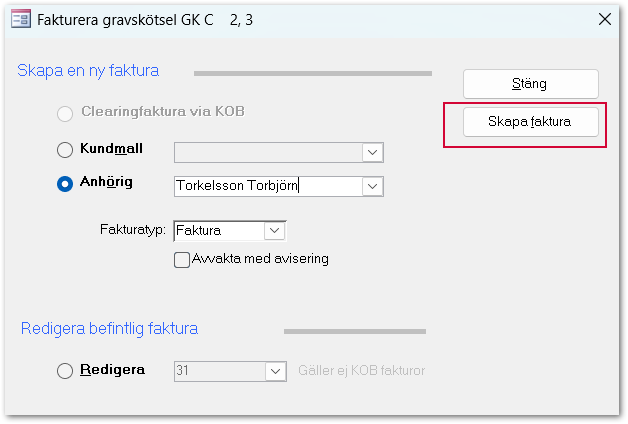 I formuläret Fakturera gravskötsel kan kund eller kundmall väljas. Klicka därefter på Skapa faktura.