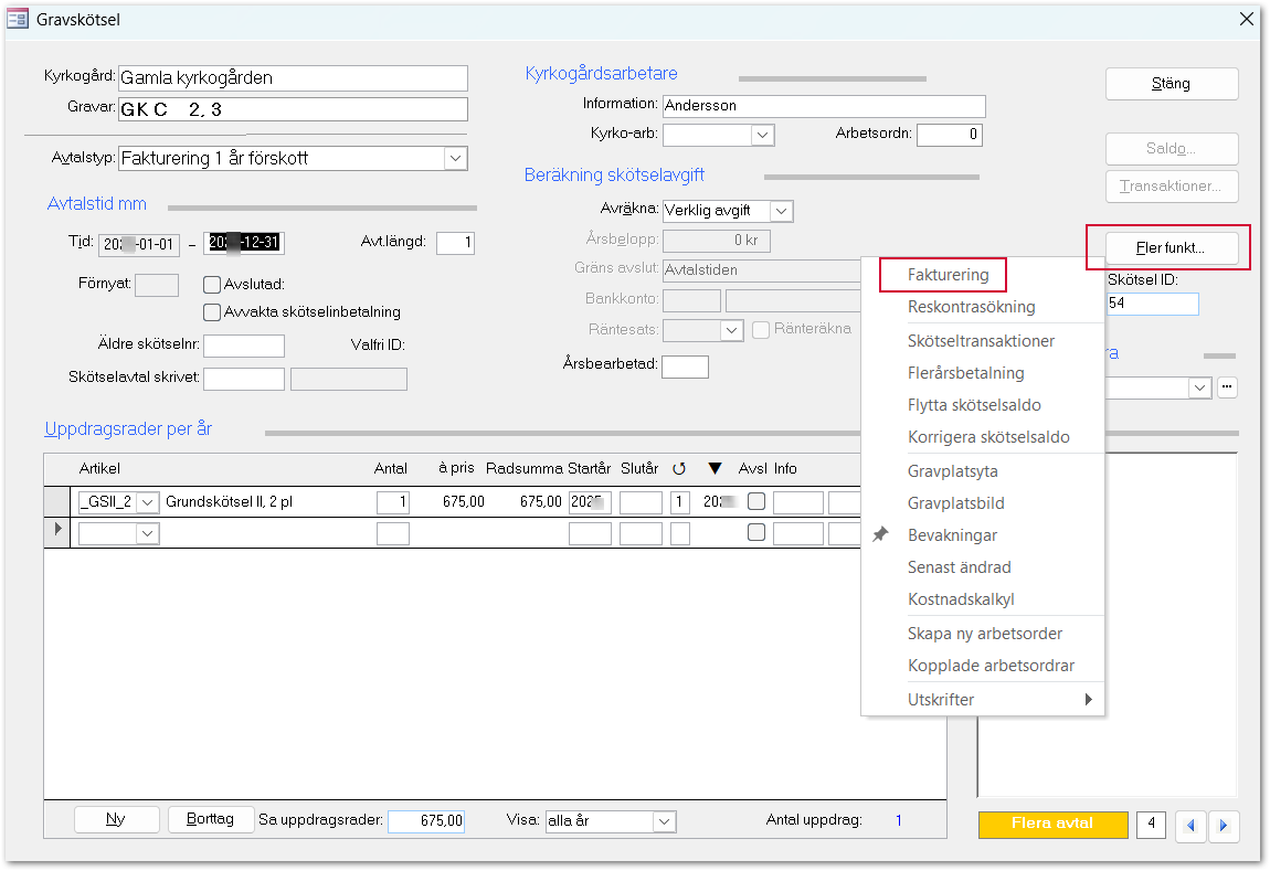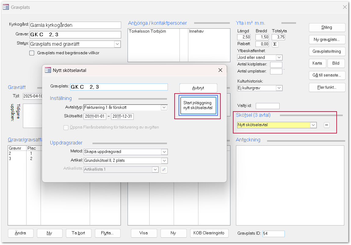 Formuläret Gravskötsel öppnas och här går det att komplettera avtalet med fler artiklar.