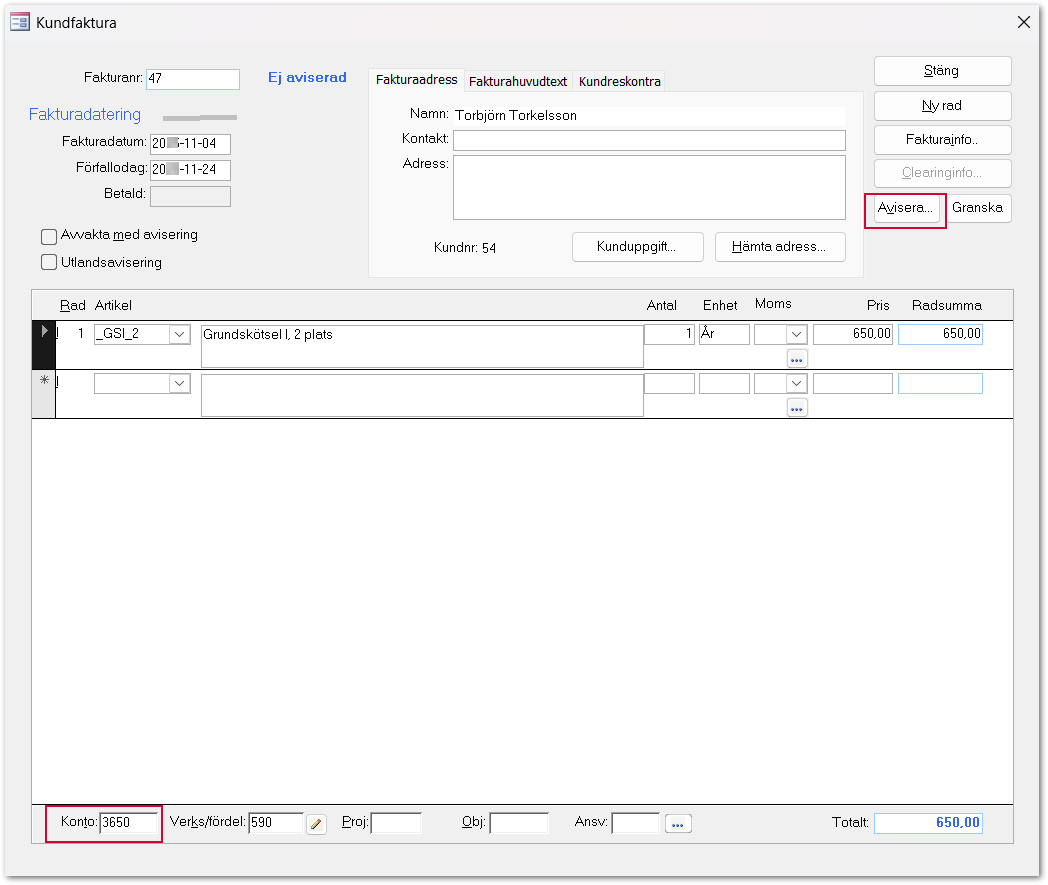 Formuläret Kundfaktura öppnas och här läggs artikeln/artiklarna in. Kontrollera så att det är ett intäktskonto ifyllt nere till vänster, eftersom faktureringsavtalen ska intäktsföras direkt.