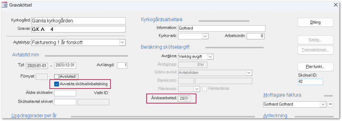 Gå tillbaka till gravplatsen och öppna skötselavtalet. Sätt en bock i Avvakta skötselinbetalning och skriv årtalet 20xx i fältet Årsbearbetad.