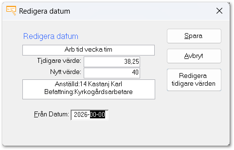 - Uppdatera värdet i fältet Arb tid vecka tim och ange hur många timmar den anställde arbetar i veckan. Vid heltid blir värdet 40.00, men vid deltidsanställning blir timmarna färre.