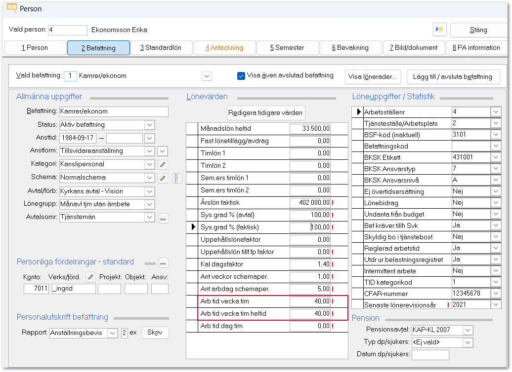 - Ändra värdet i fältet Arb tid vecka tim heltid till 40.00.