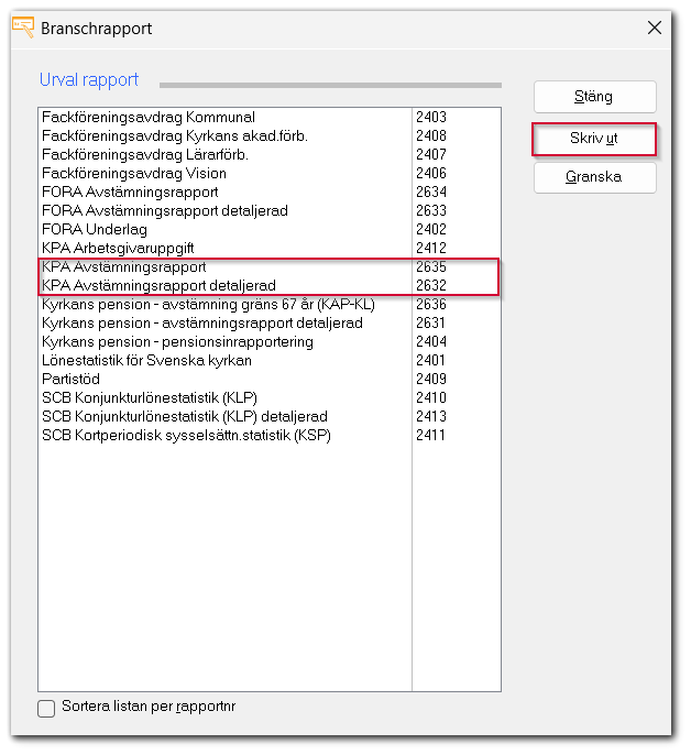 - Skriv ut KPA Avstämningsrapport 2635 och KPA Avstämningsrapport detaljerad 2632. Granska och jämför de båda rapporterna med varandra, person för person. Jämför lönesummorna och övriga uppgifter per person och konstatera om det finns avvikelser och varför.
