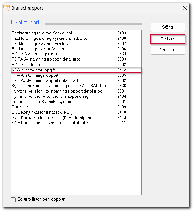 - Om allt ser bra ut ska du gå tillbaka till Branschrapport för att skriva ut KPA Arbetsgivaruppgift 2412.