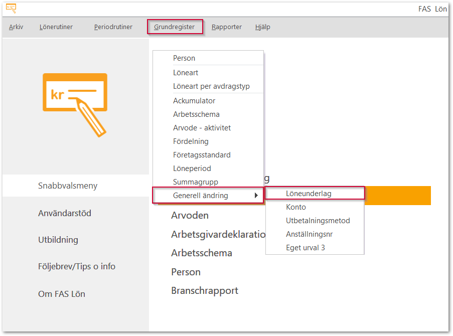 Gå in på Grundregister > Generell ändring > Löneunderlag.