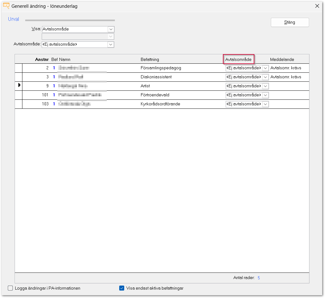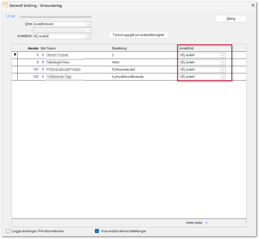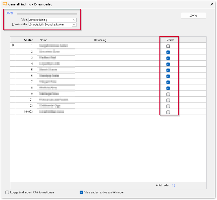 Ange vilka personer som ska vara med i lönestatistiken genom att kyssa för eller ur personen i kolumnen Värde.