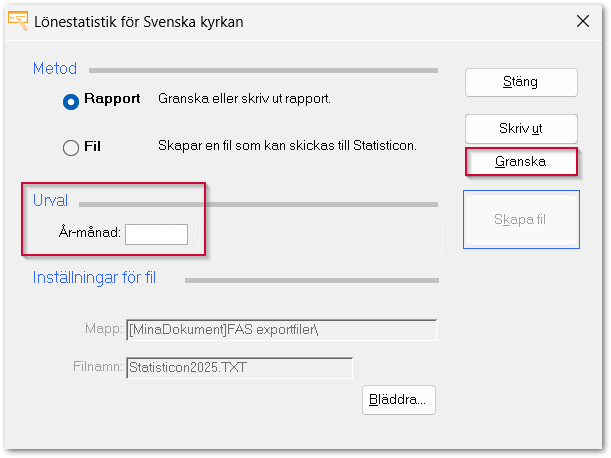 - Under Urval skriver du in den period som lönestatistiken avser och klickar därefter på Granska.