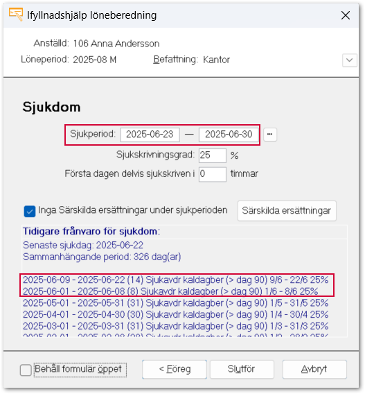 OBS! Eftersom det bara är den period som sammanfaller med semestern som ska hanteras manuellt behöver sjukperioden delas upp i flera perioder.