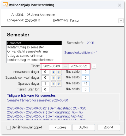 - Efter att den sista perioden är registrerad väljer du istället Semester i Ifyllnadshjälpen.