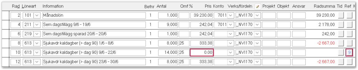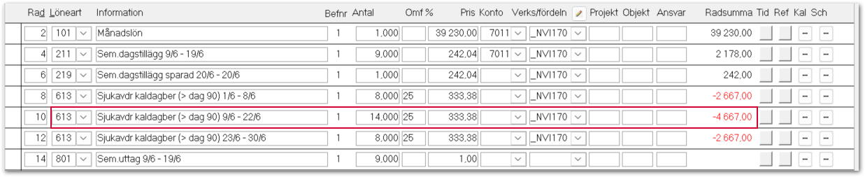 - I Löneberedningen har nu lönearter för sjukdom och semester tillkommit. Genom att trycka på Beräkna syns det att det har gjorts ett sjukavdrag för perioden som motsvarar perioden för semester, vilket måste justeras.