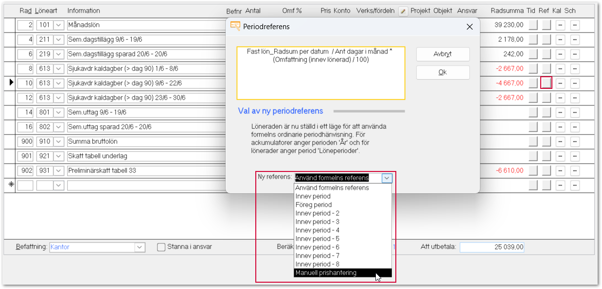 - Tryck på Ref på den aktuella raden och ange Manuell prishantering som Ny referens. Tryck på OK för att spara.