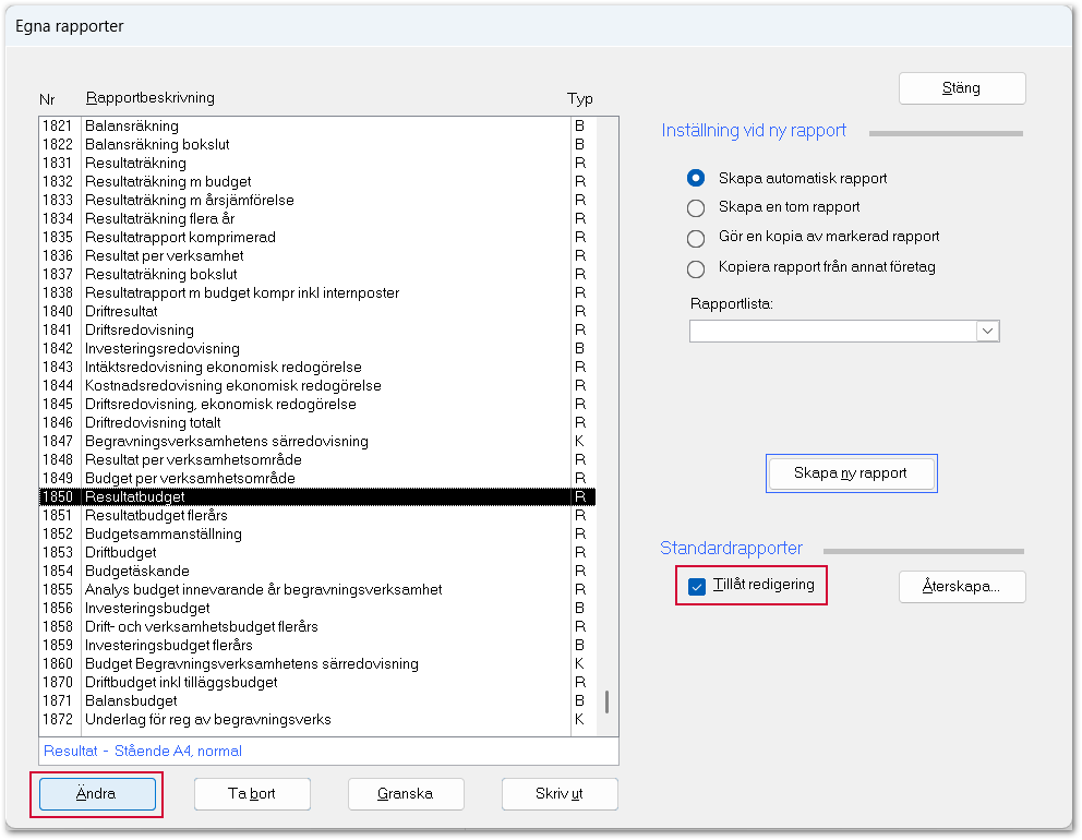För att rätta dessa rapporter gå till funktionen Egna rapporter som finns under Rapporter. Sätt en bock i rutan Tillåt redigering och markera den rapport som ska ändras och klicka på Ändra.