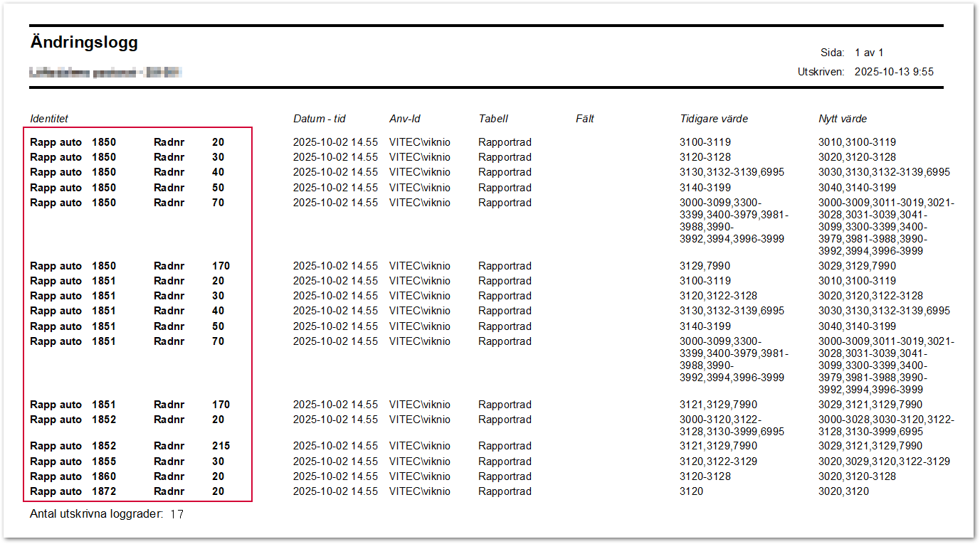Börja med att ta ut en Ändringslogg. Detta för att se vilka rapporter som är uppdaterade med de nya kontona, här visas också vilka radnummer som behöver rättas.