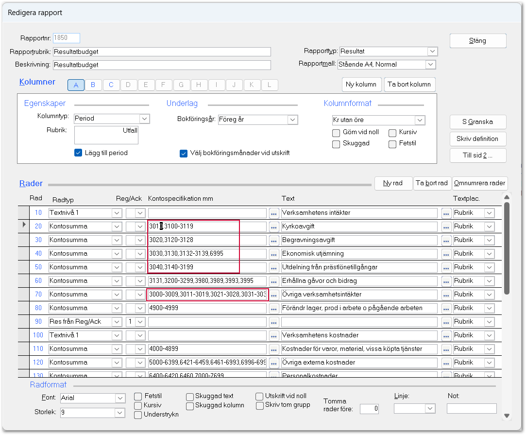 Under Redigera rapport ändrar du alla de berörda rapportraderna i den aktuella rapporten genom att ändra en siffra - till exempel lägga till en nolla och sedan ta bort den igen – detta gör att det faktiska urvalet uppdateras.