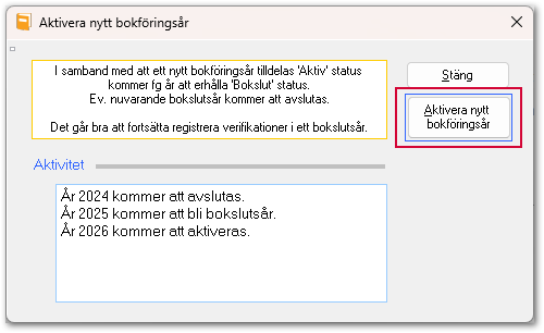 - Öppna formuläret Aktivera nytt bokföringsår via något av alternativen