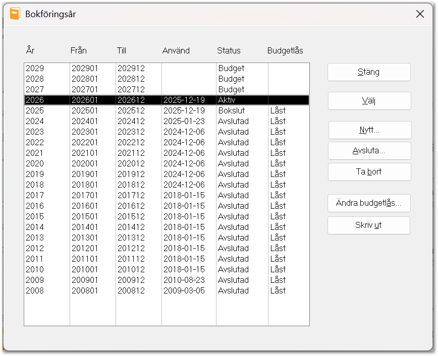 - Nu är det nya bokföringsåret aktiverat. Genom att klicka på Bokföringsår... på startsidan får du upp en översiktsbild över samtliga bokföringsår och kan växla mellan aktivt bokföringsår och bokslutsåret.