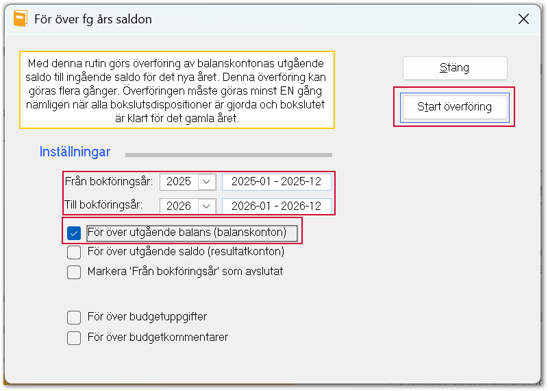 - Kontrollera att rätt år är valda i Från bokföringsår och Till bokföringsår och att För över utgående balans (balanskonton) är markerad. Klicka på Start överföring.