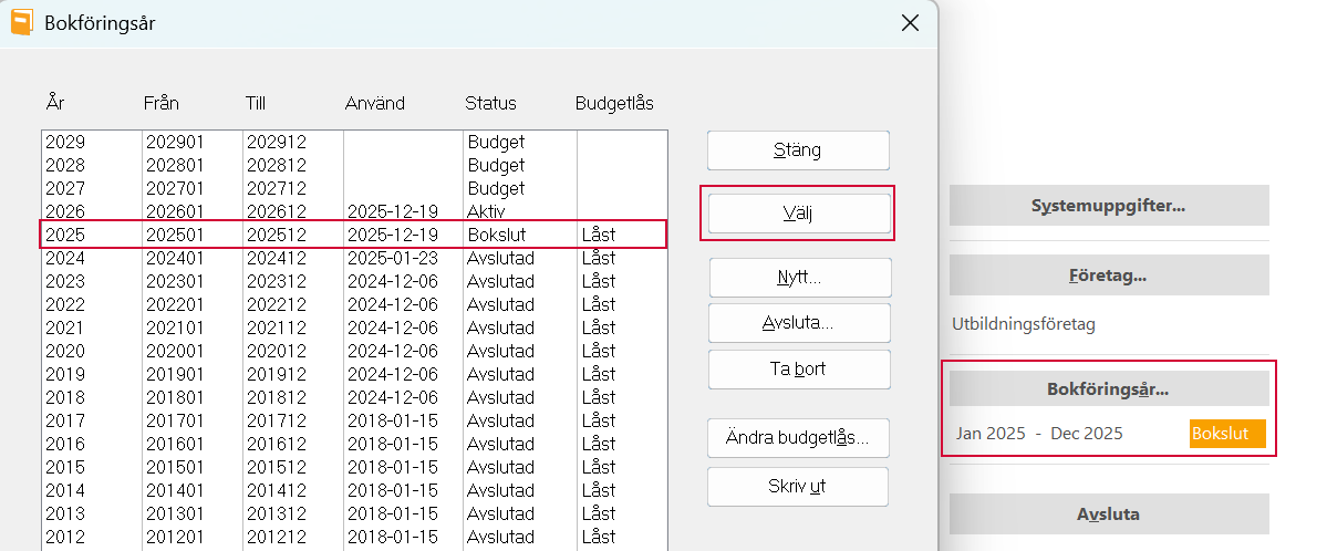 - Ändra till bokslutsåret genom att klicka på Bokföringsår... på startsidan, markera bokslutsåret och klicka på Välj.