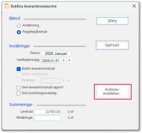 - För att ändra leverantörsskulddatum klickar du på Ändra lev.skulddatum... i formuläret Bokföra leverantörsreskontra.