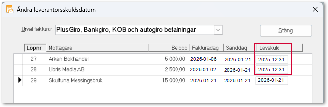 - Ändra datum för önskade fakturor i fältet Levskuld.
