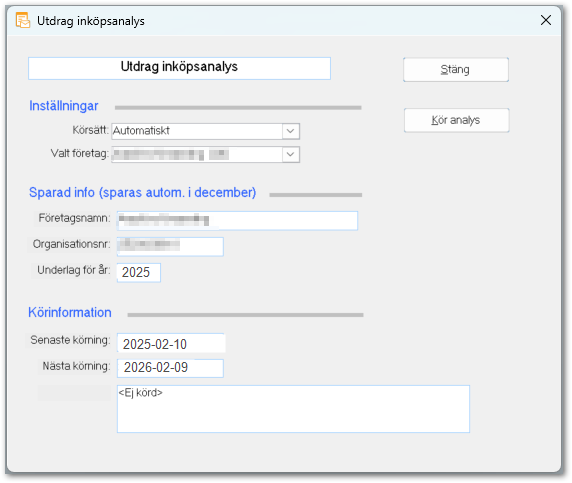 Körsätt och företag kan väljas och ändras via Arkiv > Underhåll > Tilläggsrutiner > Utdrag inköpsanalys. I formuläret Utdrag inköpsanalys visas när inköpanalysen senast kördes och när det är dags för nästa körning.