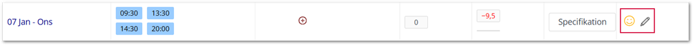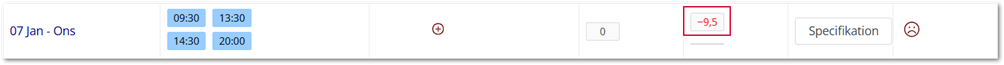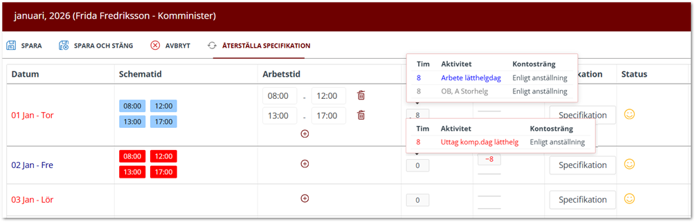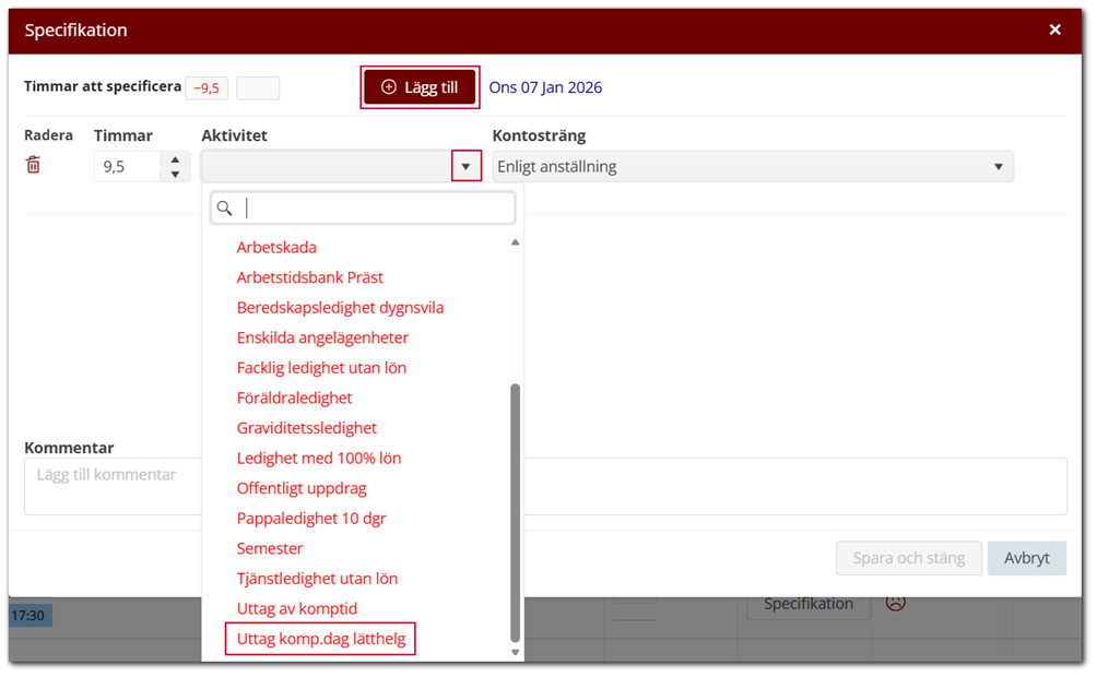 - Den röda gubben visar att tiden måste specificeras manuellt. Tryck på Specifikation och sedan på Lägg till. Välj aktiviteten Uttag komp.dag lätthelg och sedan på Spara och Stäng.