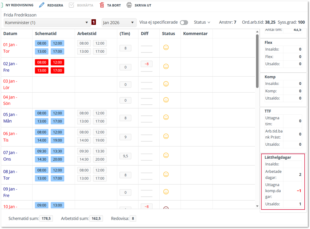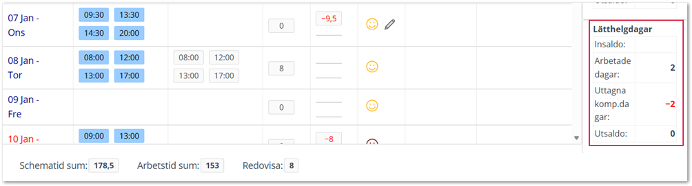 - När tidredovisningen är sparad och stängd visas saldot för Lätthelgdagar längst ner till höger.