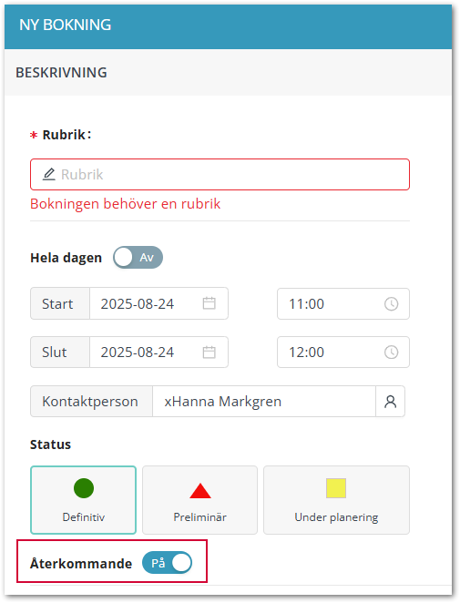 För att skapa en återkommande bokning så flyttar du reglaget Återkommande till På.