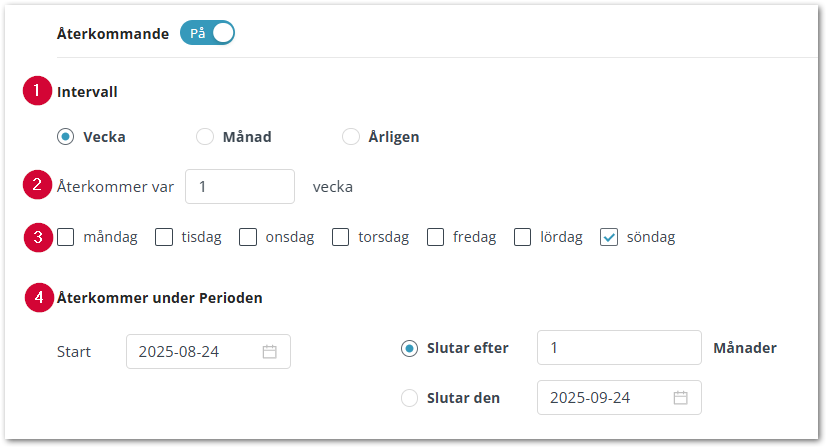- Välj om bokningen ska återkomma veckovis, månadsvis eller årligen.
