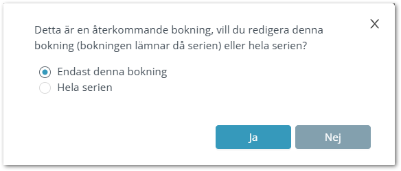 Om du försöker öppna en bokning som ingår i en serie så kommer du få en fråga om du vill öppna den enskilda bokningen eller hela serien.