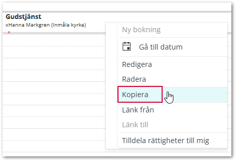 En bokning i kalendern kan kopieras till ett eller flera senare datum. Högerklicka på bokningen i kalendern och välj Kopiera.